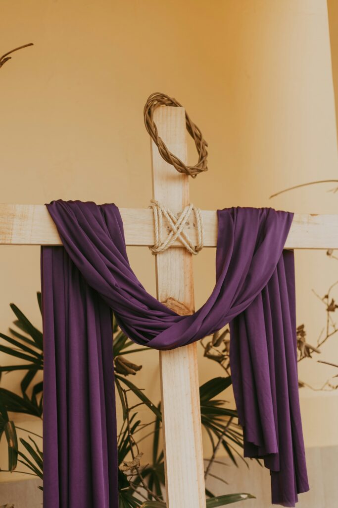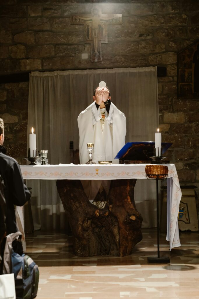Person in a blue long sleeve shirt with clasped hands praying over an open bible